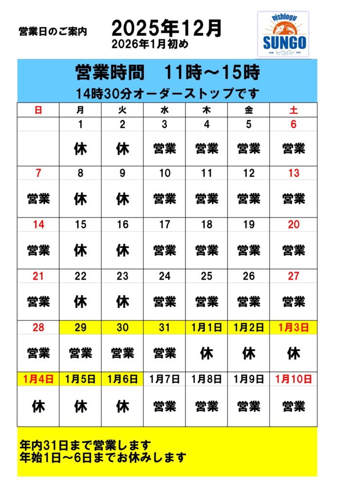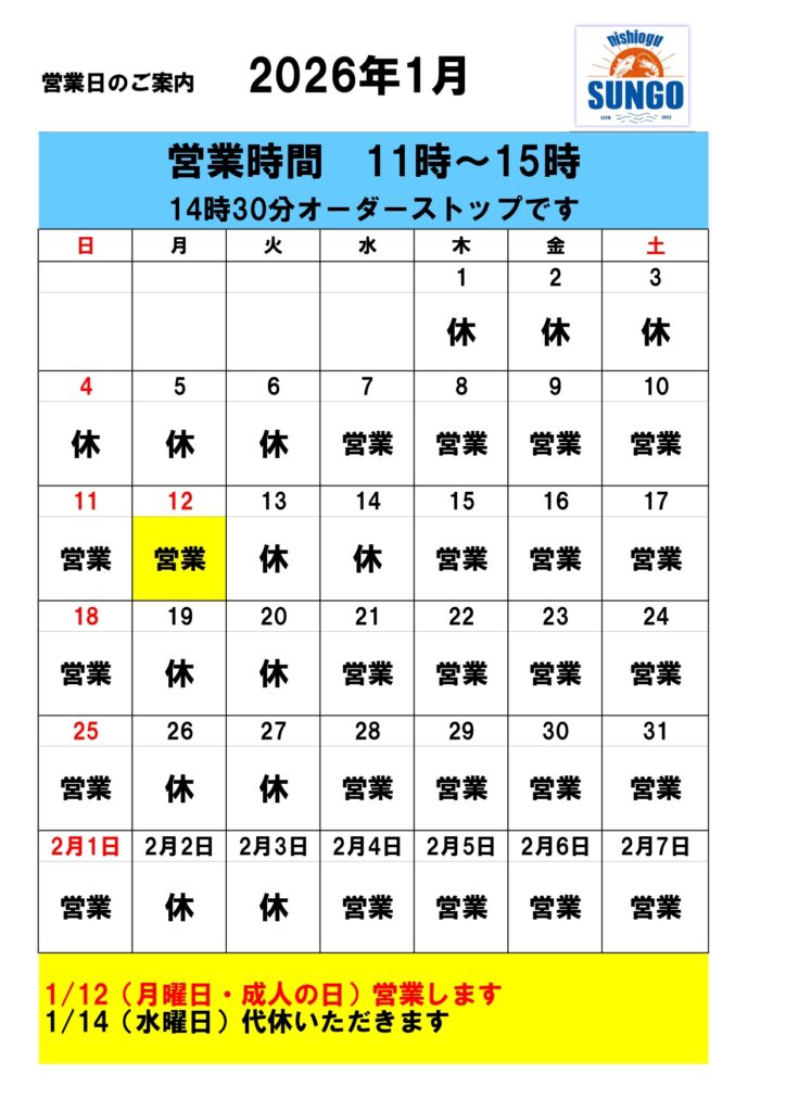 西尾久さんご 営業日カレンダー